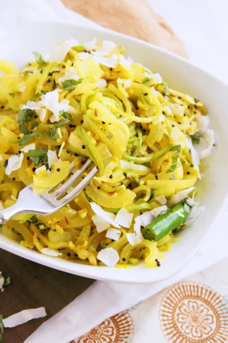I made a few little changes to the original recipeā¦due to my infatuation with āspiralizingā food, I opted to create chayote spirals instead of grating. I couldnāt find curry leaves so I substituted fresh basil leaves with a splash of freshly squeezed lemon juice. I also made the swap of dried coconut in place of freshly grated based on availability in addition to a serrano instead of a green chili. Since I enjoy strong spices, I increased the amount of tumeric and coconut and threw in some cumin seeds just for fun. Iāll be whipping this quick recipe up again soonā¦could chayote be my new favorite food craze?