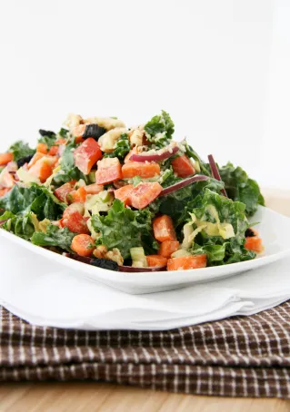 I am loving on raw kale, a hearty winter green, instead of romaine or spinach in my salads on occasion. Prior to serving, let this salad sit for 15 minutes or so to allow the greens soften up a bit and soak up all the flavors of the dressing before chowing down 🙂 Enjoy!