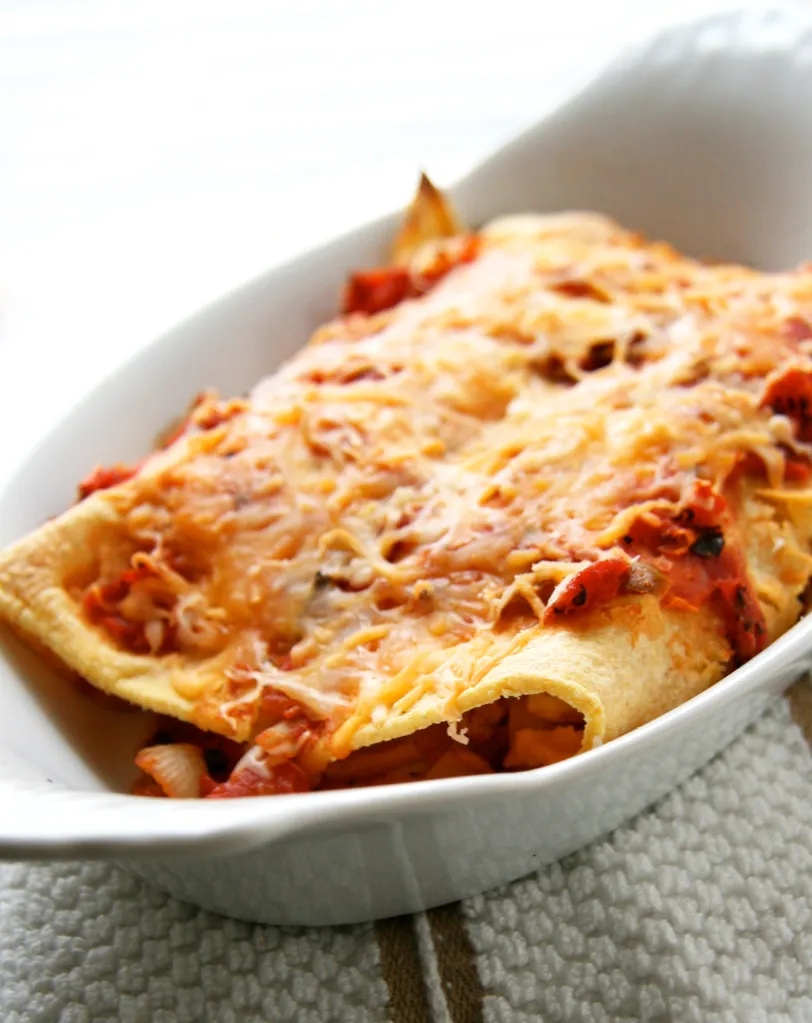 Recipe Notes: For a even quicker assembly, layer the filling, cheese, tortillas and tomato/sauce in a 9×9 pan to make an “Mexican Lasagna” or casserole. Bake as directed for 15 minutes or until cheese melts.