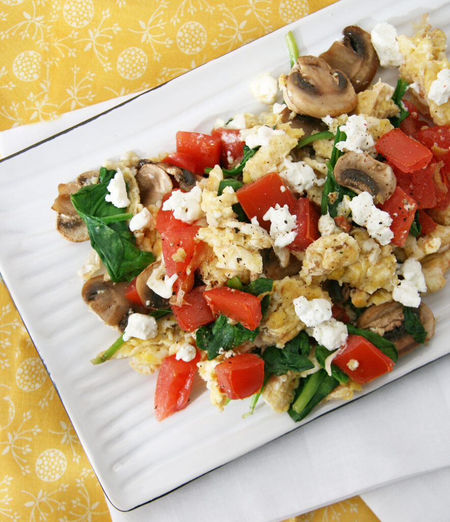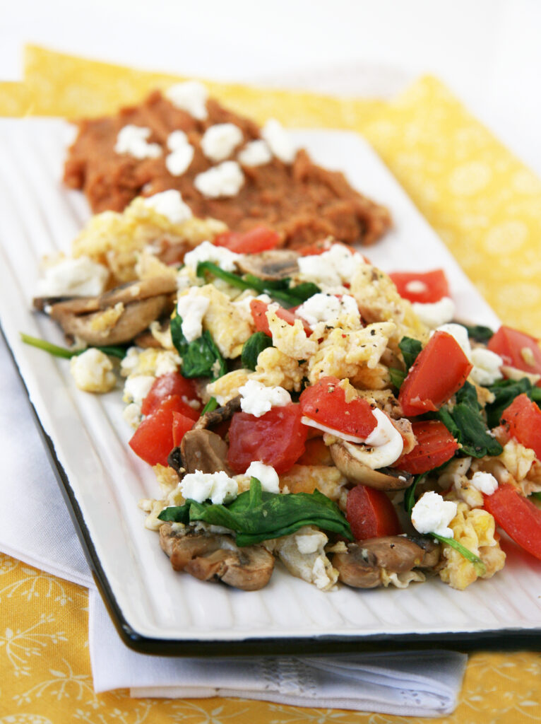 Itās been awhile since I posted an egg recipe so I am back again with an easy breakfast scramble! Creamy goat cheese, fresh tomatoes, mushrooms and spinach combine for a veggie-packed breakfast that is both satisfying and filling. I served this scramble with leftover refried beans topped with crumbled goat cheese; I know it doesnāt match the cuisine but adding fiber-packed ingredients to my meals helps keep me full longer.