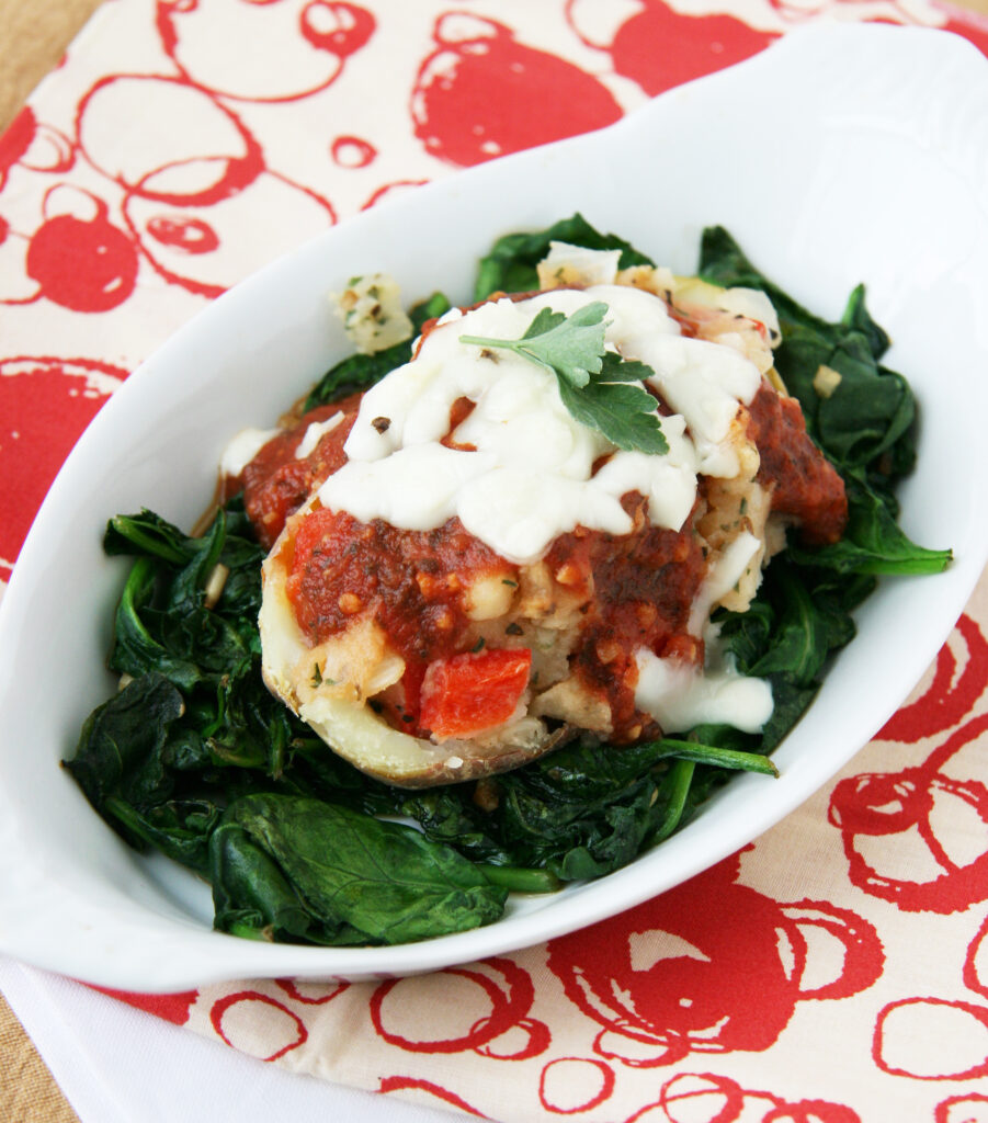First up this week are my pizza potatoes that are served over a bed of sauteed garlic spinach…I had to sneak more veggies in there somehow. The only way I used to eat baked potatoes was slathered in ketchup…times have changed as this recipe won me over. I’d like to think of this dish as a more sophisticated and flavor-packed version 🙂