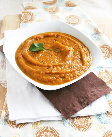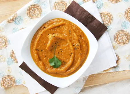 I made a few minimal changes to Lynsey’s recipe based on what I had on hand — I substituted leek for the onion and included two extra carrots (woohoo for a small veggie boost). I used coconut oil in lieu of olive oil and sprinkled a bit of black lava salt on top for a Halloween-ish look. The cilantro garnish is completely optional, it’s more for the contrast of colors I did add in the coconut milk from a can, but for photo purposes, I left those out…the soup was thick and the lite coconut milk I had looked watery and funky but it tasted delish! This soup was SO tasty – hot or cold! I even ate it chilled one day for lunch sprinkled with roasted spicy pepitas. When Lynsey mentioned this was a “must-make this Fall”, she was absolutely correct!